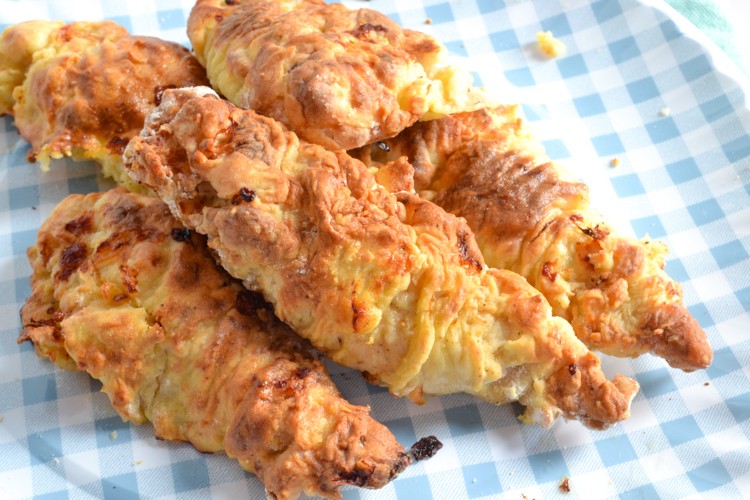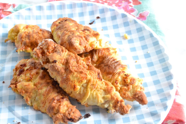 You can tell when they’re done by noticing that all the breading is cooked and has a beautiful golden brown color to it. Pull out gently, so as not to pull the chicken from the breading that may have stuck to the bottom, let cool, and then slice!