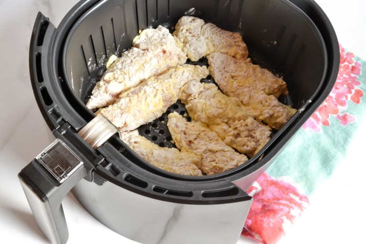 - Cook for 10-12 minutes and then check the status of the tenders, if golden brown, remove from air fryer. If not, very lightly coat with olive oil and place back in and air fry for another 5 minute increment, checking them again. Continue to cook all of the tenders until golden brown.