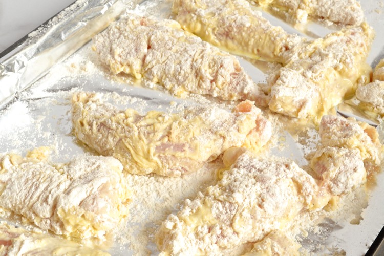 After refrigerated, mix together your eggs and buttermilk in a bowl and place the 3 cups of flour in separate bowl. To coat the chicken, take the chicken tender and place it in the flour, then dip it back in the buttermilk mixture, and finally dip it in the flour again. So it goes, flour, buttermilk, flour. Do this for all of your tenders and allow to air dry on a foil lined pan. Let air dry for 15 minutes.