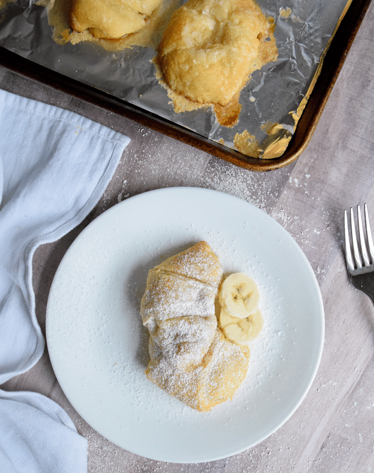 Combine cream cheese, sugar and vanilla in a bowl and mix on high. Once mixed, unroll your crescent rolls and take your first corner. Starting at the largest end, add a tablespoon of cheesecake mixture, next sprinkle some brown sugar on top, then add a half of banana on top. Tuck the edges over top of the banana and then rollup.
