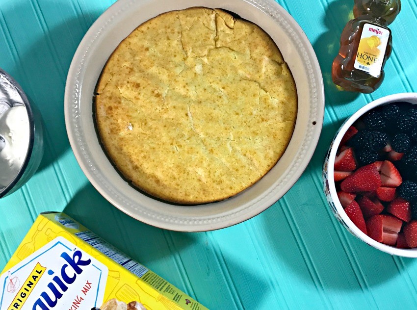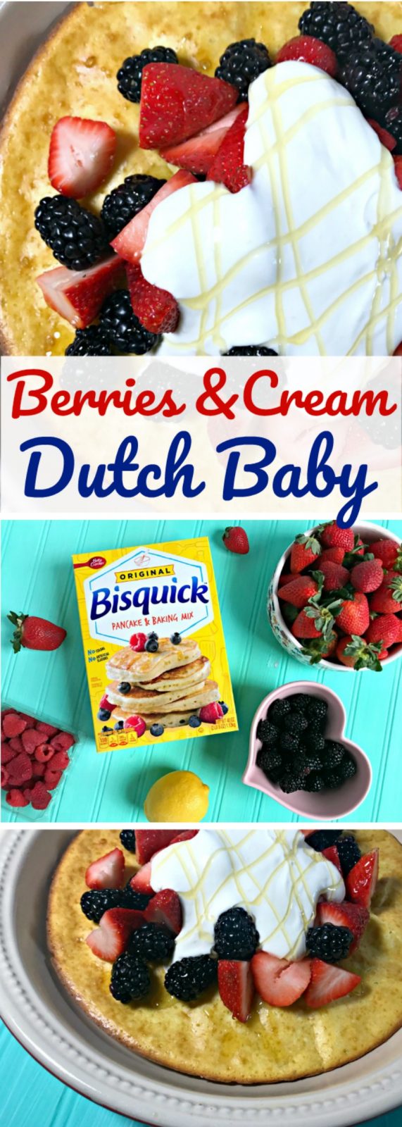 I’m always looking for delicious breakfast recipes and brunch recipes and one of my favorite new recipes is this Berries and Cream Dutch Baby! A Dutch Baby, if you’ve never had one before, is pretty much a baked pancake, but full of fluffy, deliciousness. They are very easy to make and when topped with berries and cream, you really can’t go wrong! Today I’ll show you how you can make a yummy Dutch Baby using Bisquick Pancake Mix to make things even easier!