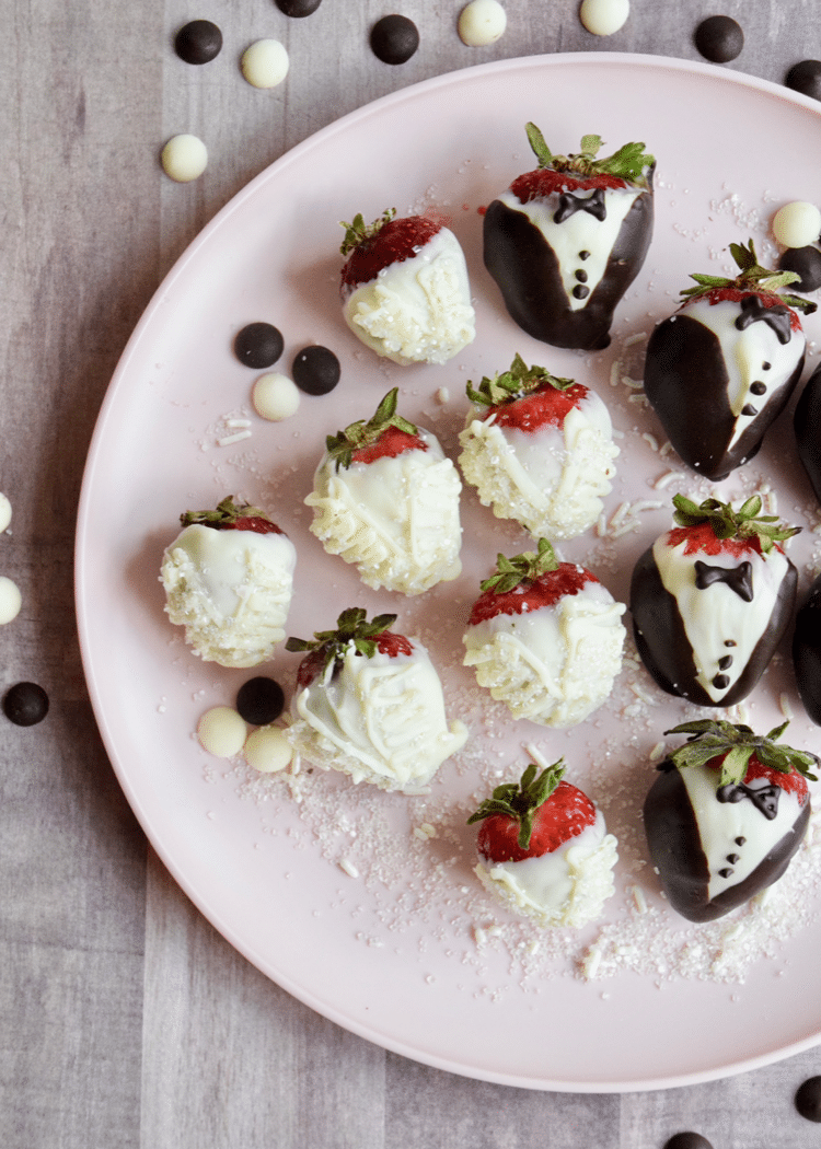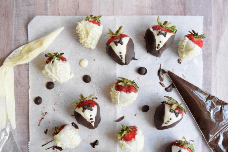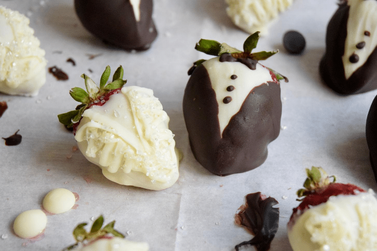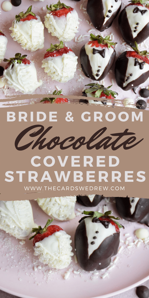 For the bride strawberries, dip the whole thing into white chocolate and then place on wax paper and let harden.