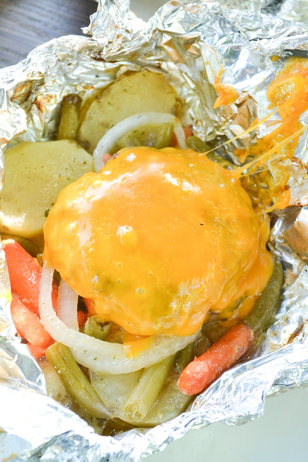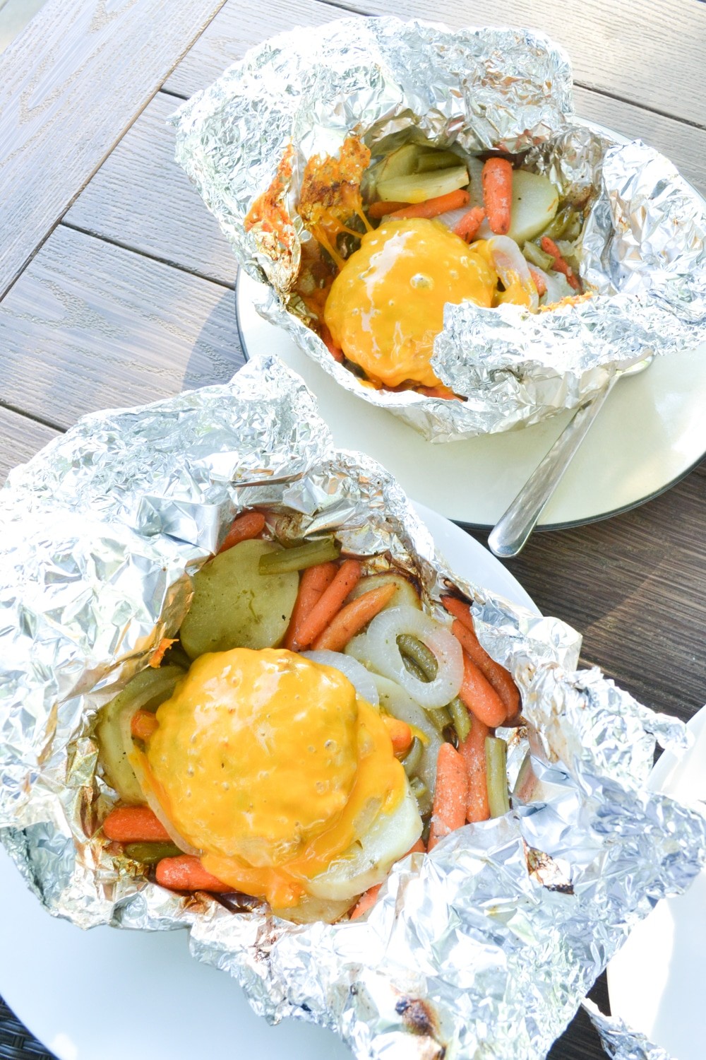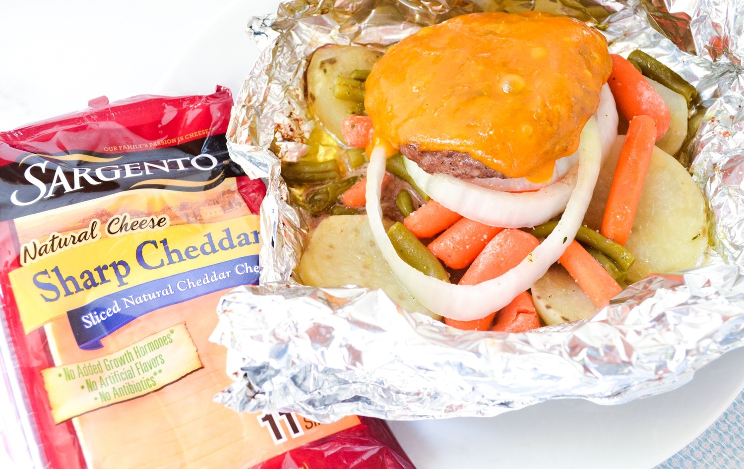 Once your timer goes off, gently open up one of the packets (don’t destroy them in the process) and survey the results. Are the carrots cooked? Are the potatoes soft? Is the meat done? If you can answer yes to all those questions then comes the moment of truth when you get to add the final delicious touch to your meal! Carefully open up the foil packets and place your cheese on top. We like to use Sargento® Sliced Sharp Natural Cheddar Cheese but if you prefer a different flavor, Sargento offers other great varieties such as Sargento® Sliced Swiss Natural Cheese and Sargento® Sliced Provolone Natural Cheese with Natural Smoke Flavor. They all melt so beautifully on top of our burgers plus they’re all 100% real, natural cheese!