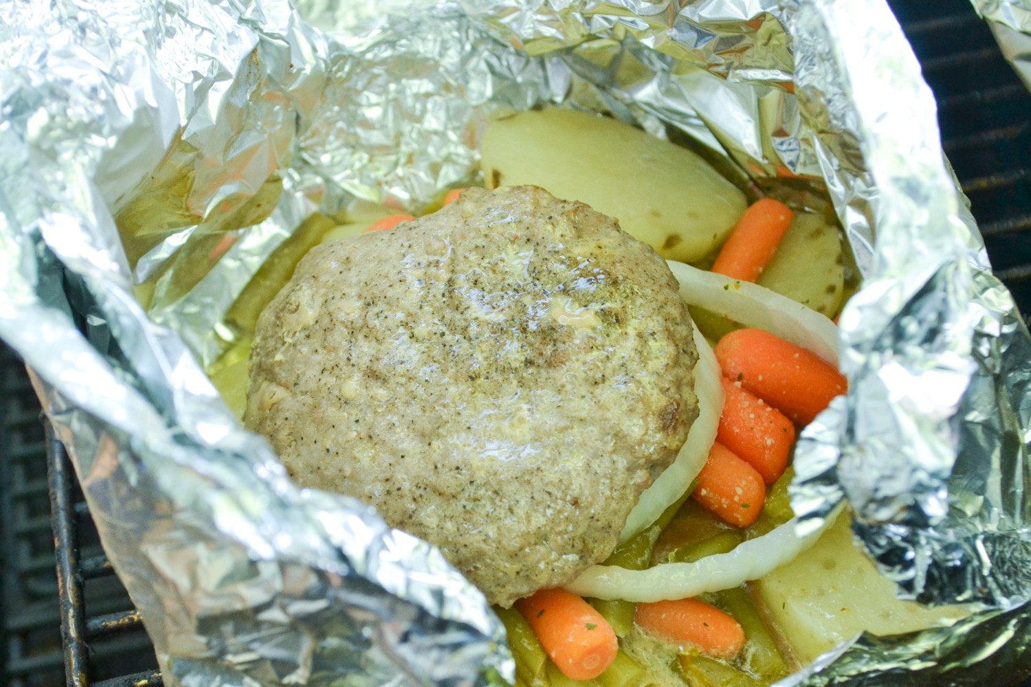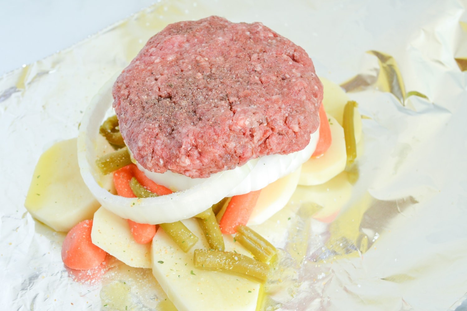 - Add hamburger patty on top and sprinkle with salt and pepper and then seal the foil packet up on all sides (being careful not to squish the contents, as well as carefully close up all sides). Instructions on how to fold up the foil packets in blog post above.