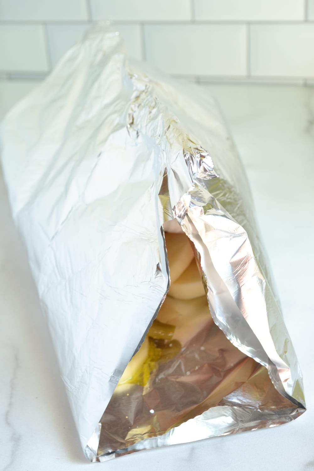 From there, we wrap them up. I start by pulling the two shortest sides of the foil together at the top and then fold downwards to create a tent.