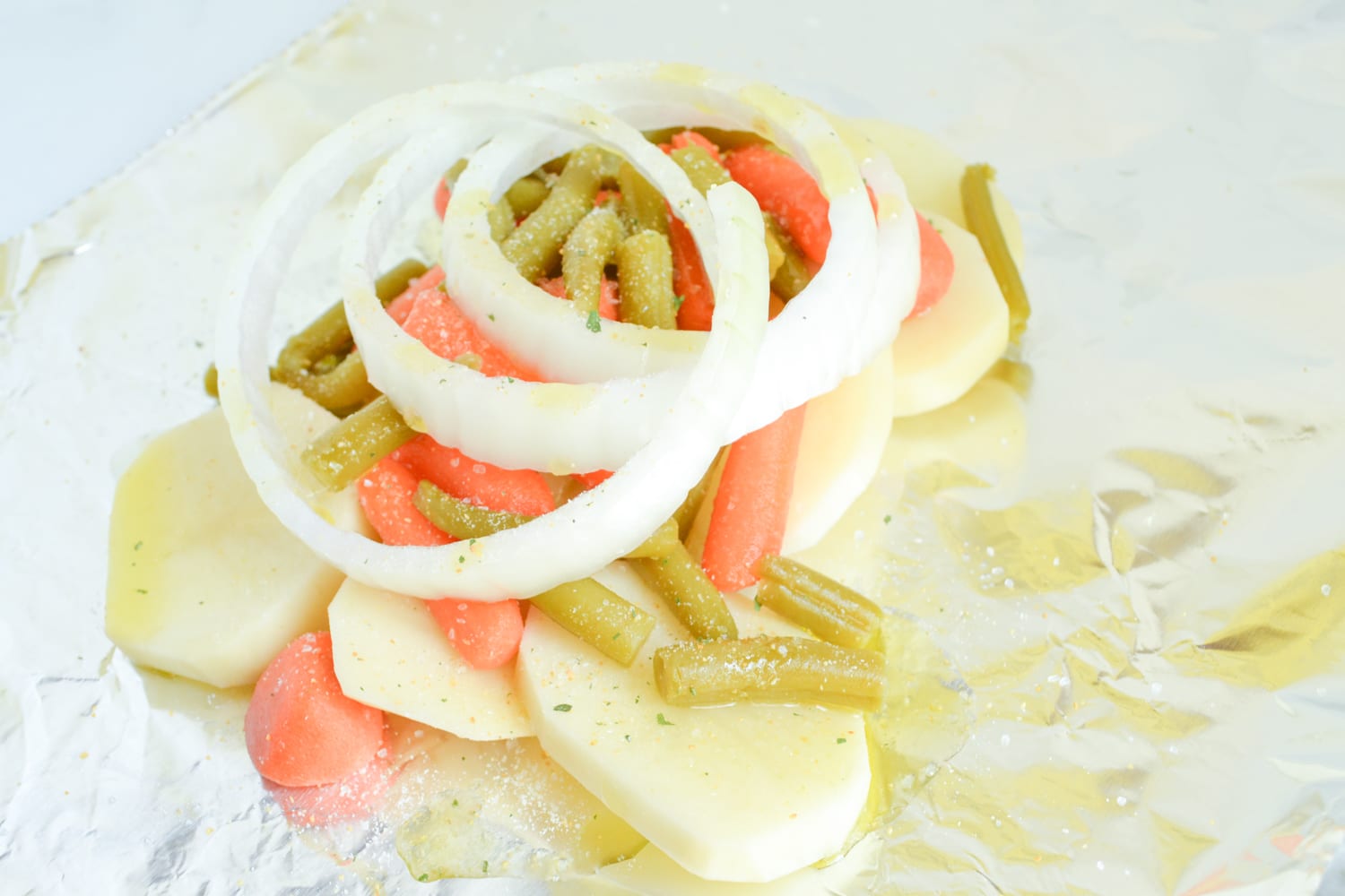 - Cut two, two foot long pieces of aluminum foil and lay them on top of each other. Then layer potatoes, carrots, onions, and green beans on top. Drizzle with olive oil and then sprinkle with salt and pepper and garlic salt.