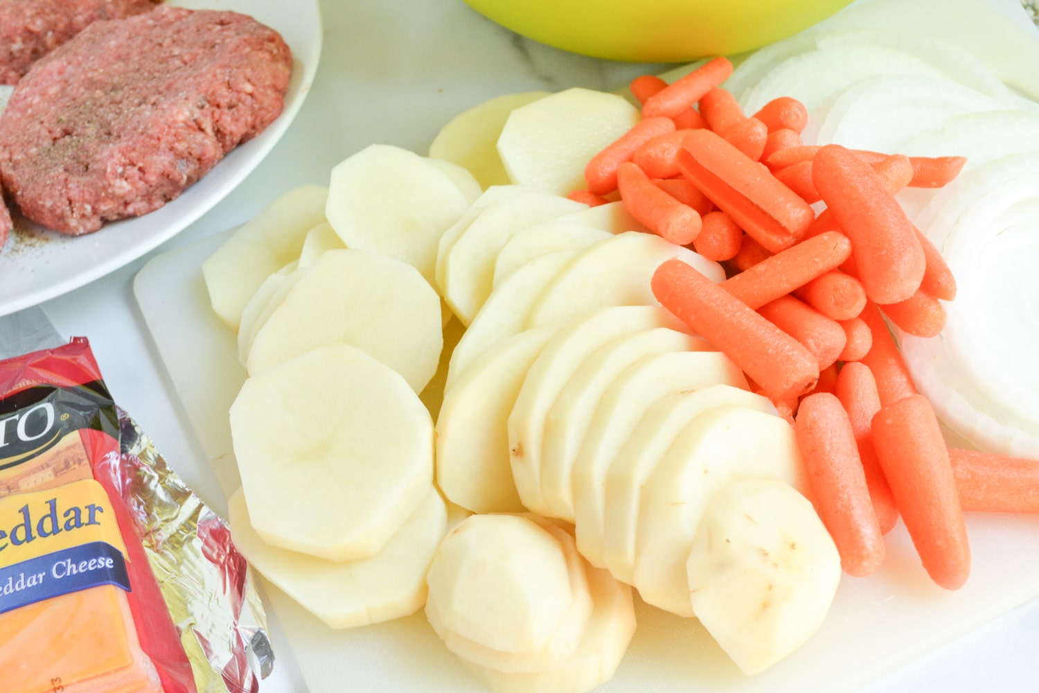 - Prepared your vegetables: peel and slice potatoes, cut carrots in half, slice up onion, and prepare green beans.