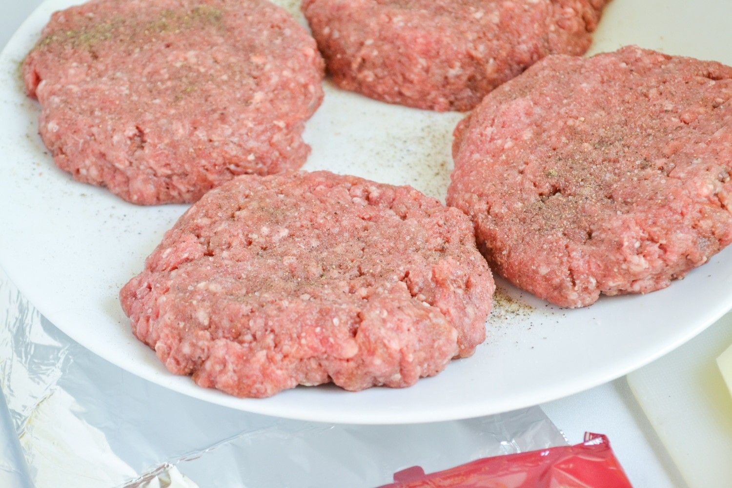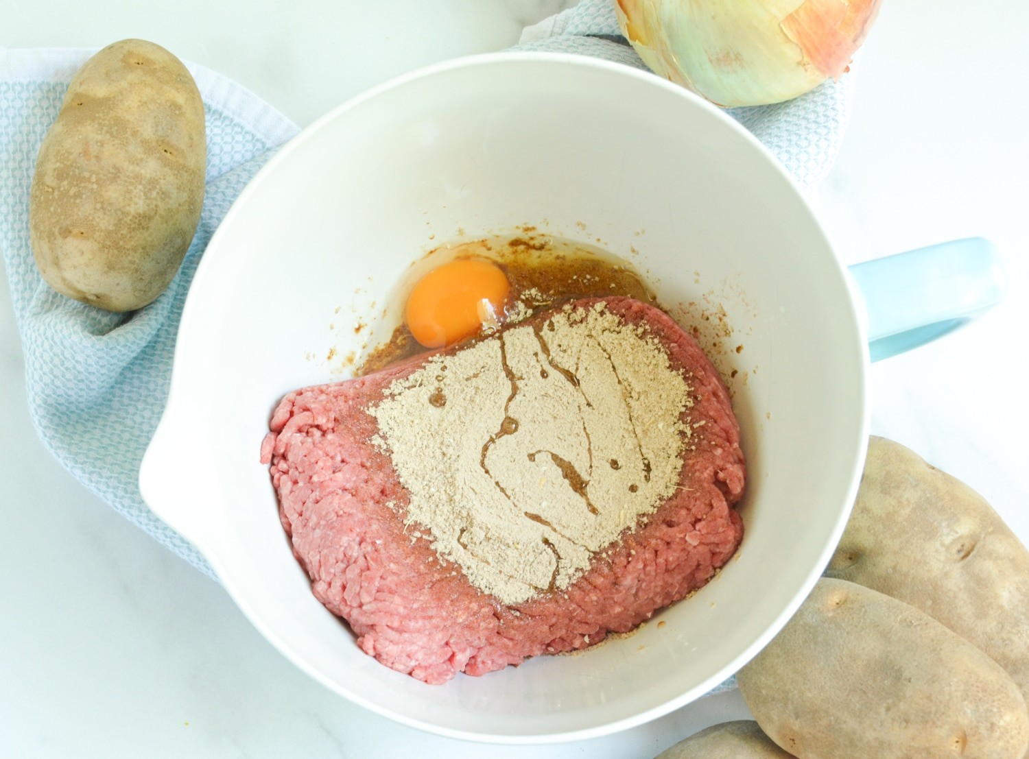 - Start by combining ground beef, onion soup mix, and egg in a large bowl and mix up. Then form into four large hamburger patties.