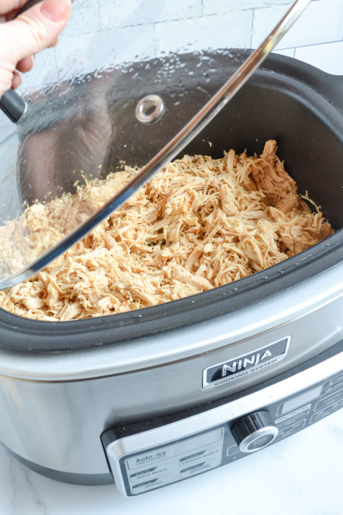 After the chicken is tender to the touch (usually around six hours on low), I typically just use two forks to gently pull the chicken apart. I’ve also seen people that toss their chicken into a mixing bowl on low and let the mixer gently shred. Both options work, but it’s very easy to use the two fork method.
