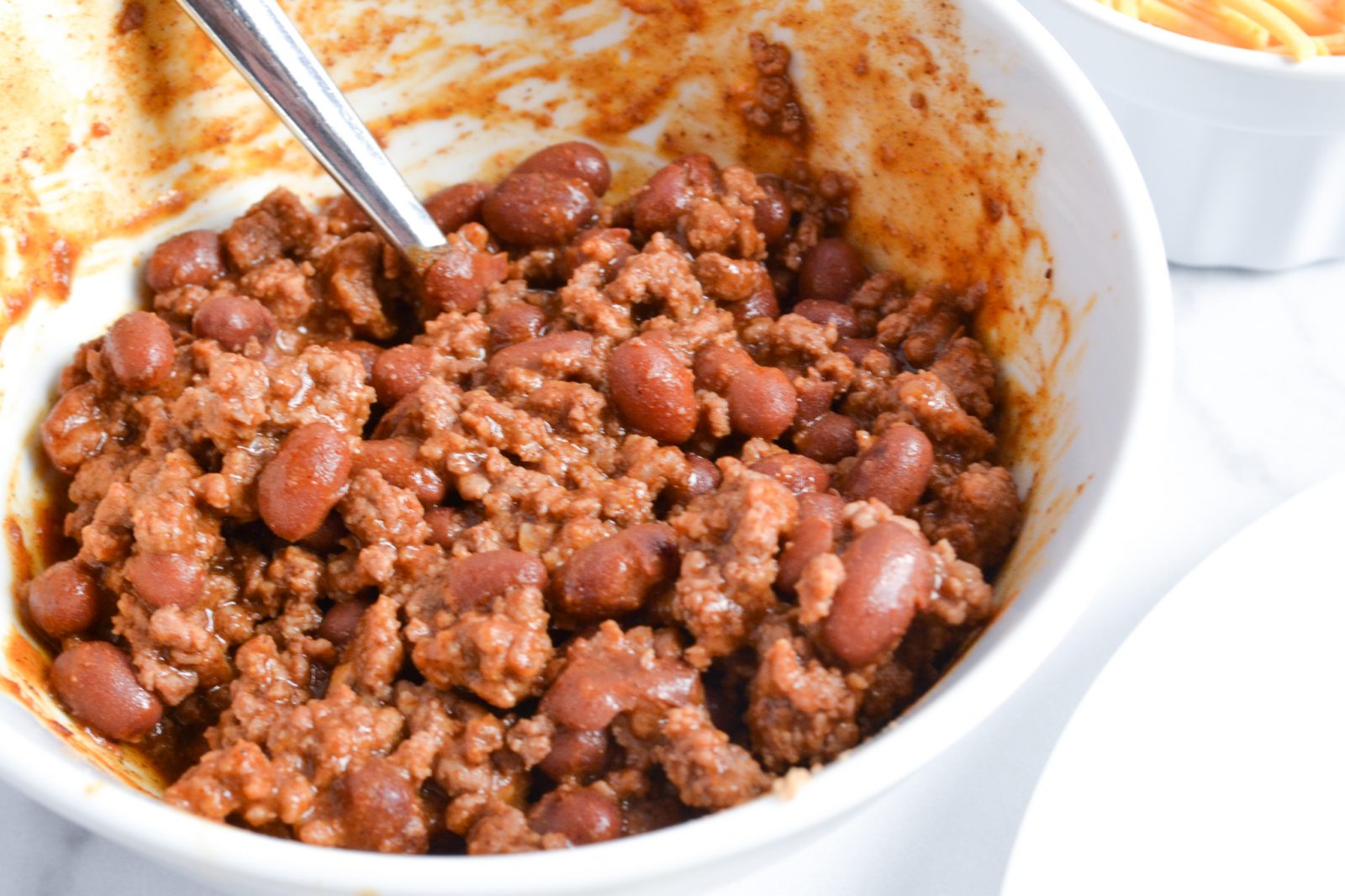 - Add in one can of chili beans in sauce (do not drain the chili sauce). It's important to use CHILI beans, not red beans or kidney beans. Add in one packet of taco seasoning and water as directed on package.