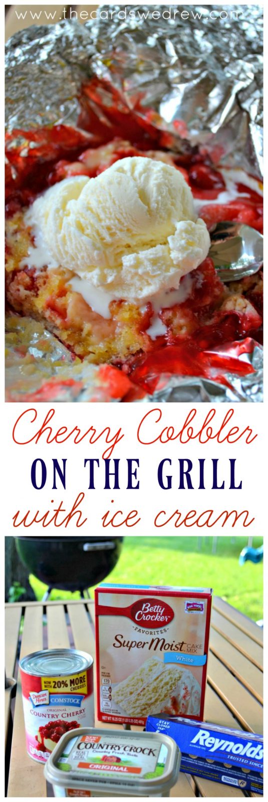 I have this great, simple cobbler recipe that my mom always used to make us as kids. She used canned pie filling, cake mix, and butter on top…baked it into a perfect crispy crust and served with ice cream. Today I’m showing you how you can turn this easy dessert idea into an easy grilled dessert recipe making Cherry Cobbler on the Grill with Ice Cream on top! And if you use your HomeRight ElectroLight Firetarter to start your charcoal grill…then you’re in even better shape because it’s going to take HALF the time you’d normally wait for the fire to start!
