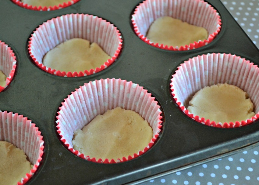 - Place cupcake liners in a cupcake pan. Slice 1/4″ to 1/2″ slices of sugar cookie dough. Place at the bottom of the liners and press into place.