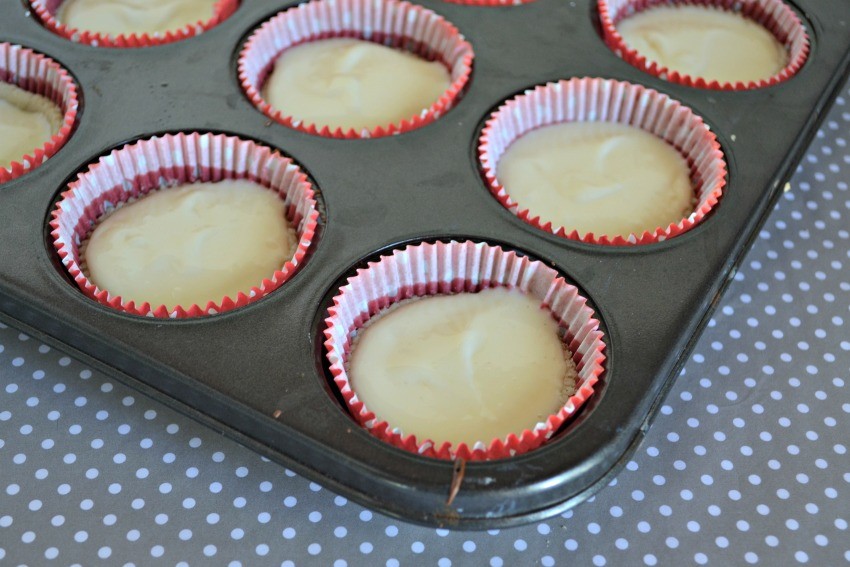 - While oven is preheating, mix together your cream cheese, sugar, eggs, and vanilla until nice and creamy and set aside.