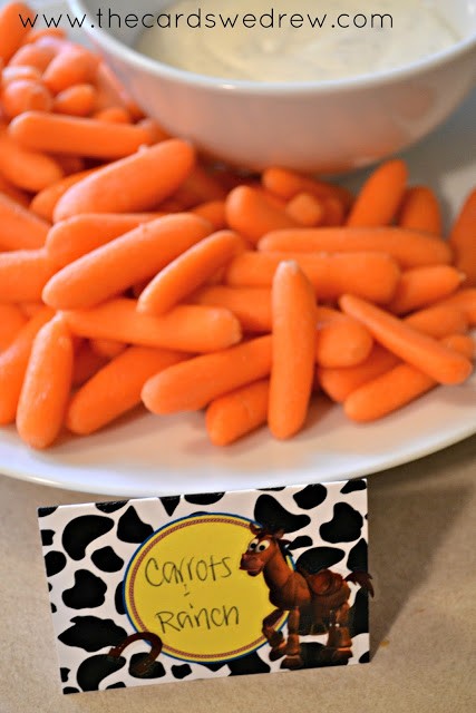 For the food, I used cute food tags courtesy of DimplePrints. I added stickers I purchased from Michael’s to incorporate the characters on them. I tried to match the characters up with the food a little bit too. Bullseye’s Carrots and Ranch…