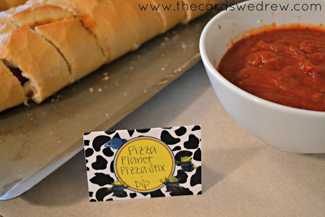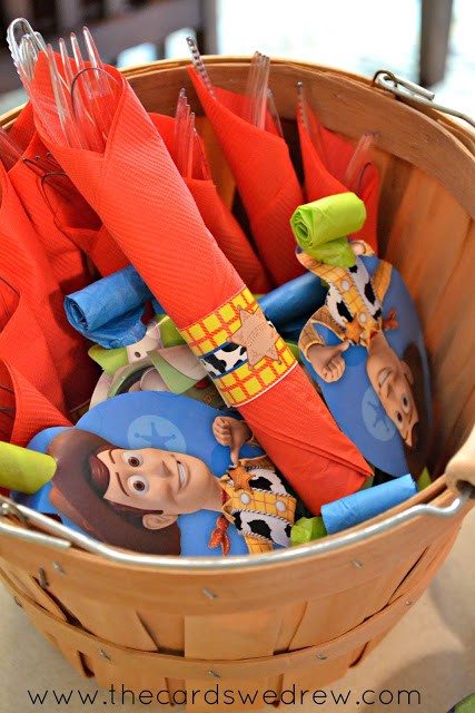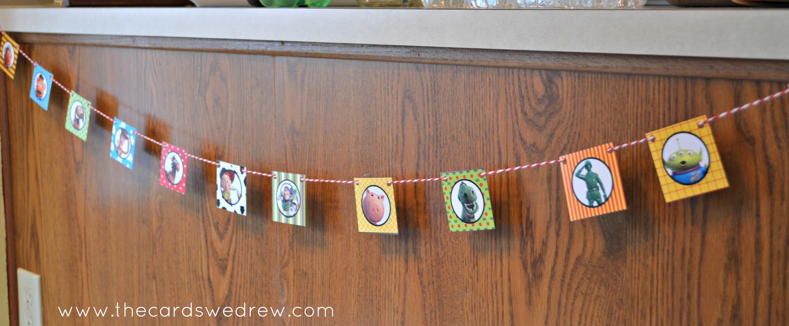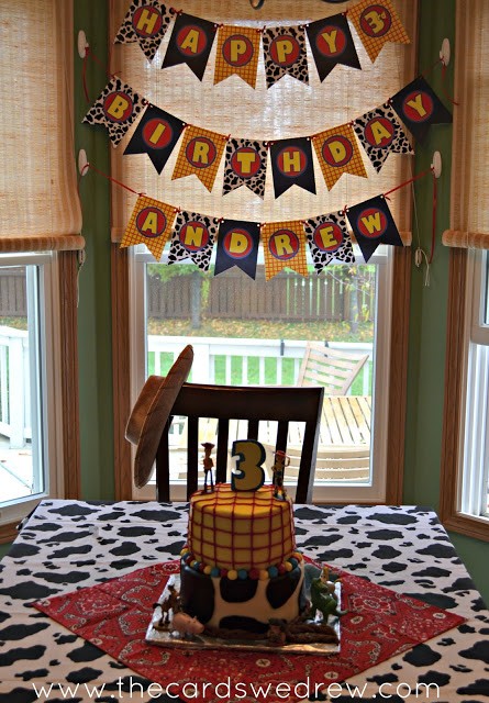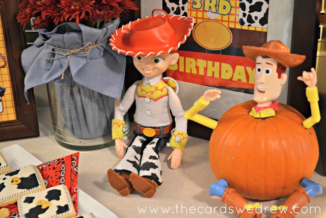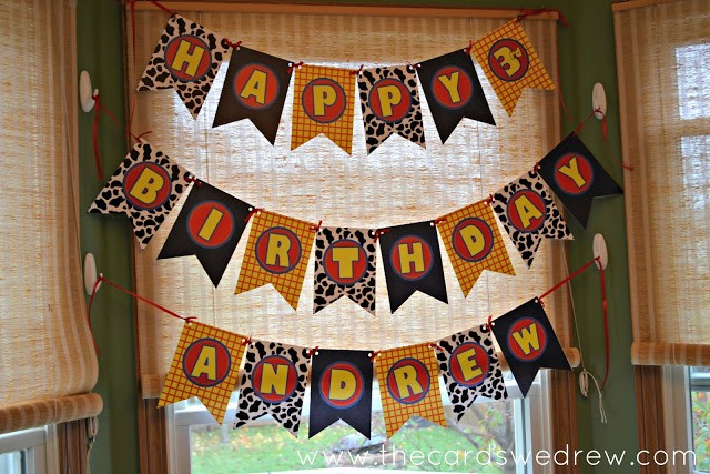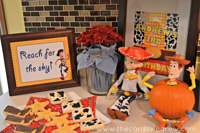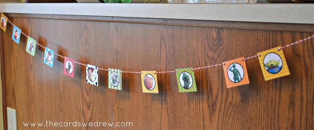DimplePrints created the Toy Cowboy inspired prints, but the licensed character prints I found on another site, Over the Big Moon, for free. I used a few of their signs and their cupcake toppers for garland.