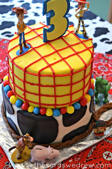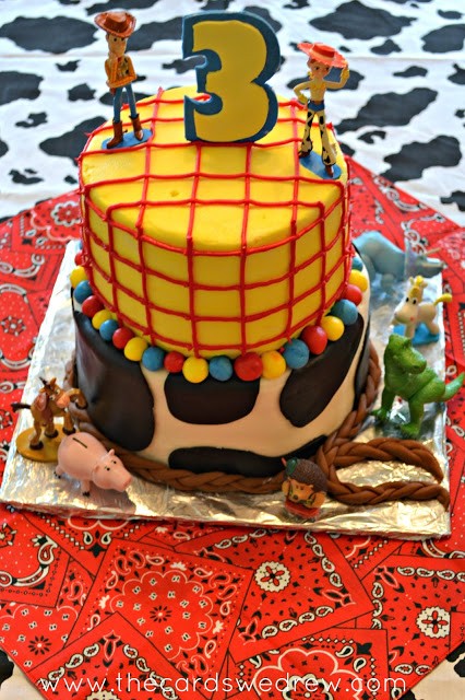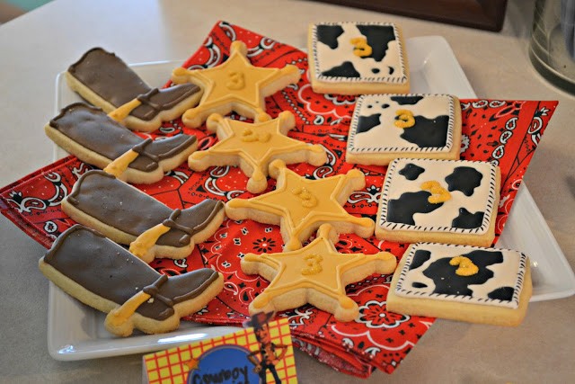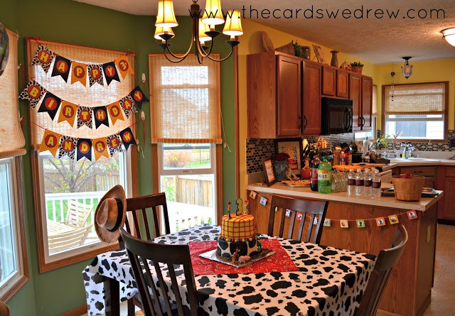 The top layer was matched with Woody’s shirt and the bottom layer with his vest. I added a cow hide print tablecloth with fabric I got from JoAnn’s and a bandana for the center of the table also from JoAnn’s.
