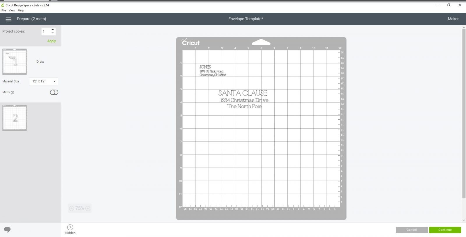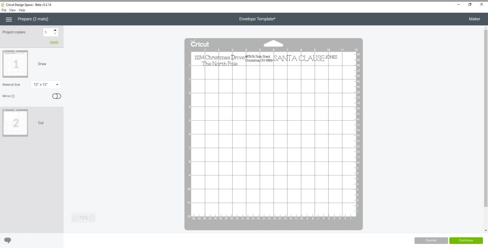 Once you hit “Make It” in the upper right corner, it will take you to this screen…one thing I do NOT like about Design Space is that all that hard work you just did on the previous screen gets undone when it brings it over to the mats. Here you will see two mats. One for Draw and one for Cut.