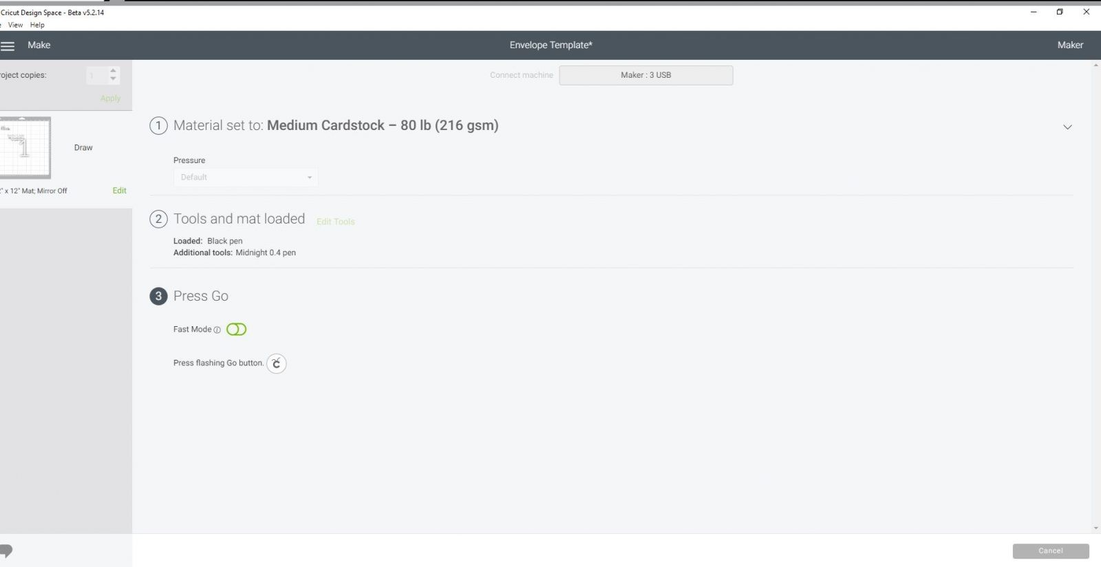 Select your material. Because “envelope” isn’t an option, I selected medium card stock. Then I selected my tool so that the Cricut knew it was using a Fine Tip Pen. Then I pushed the Cricut button to get started.