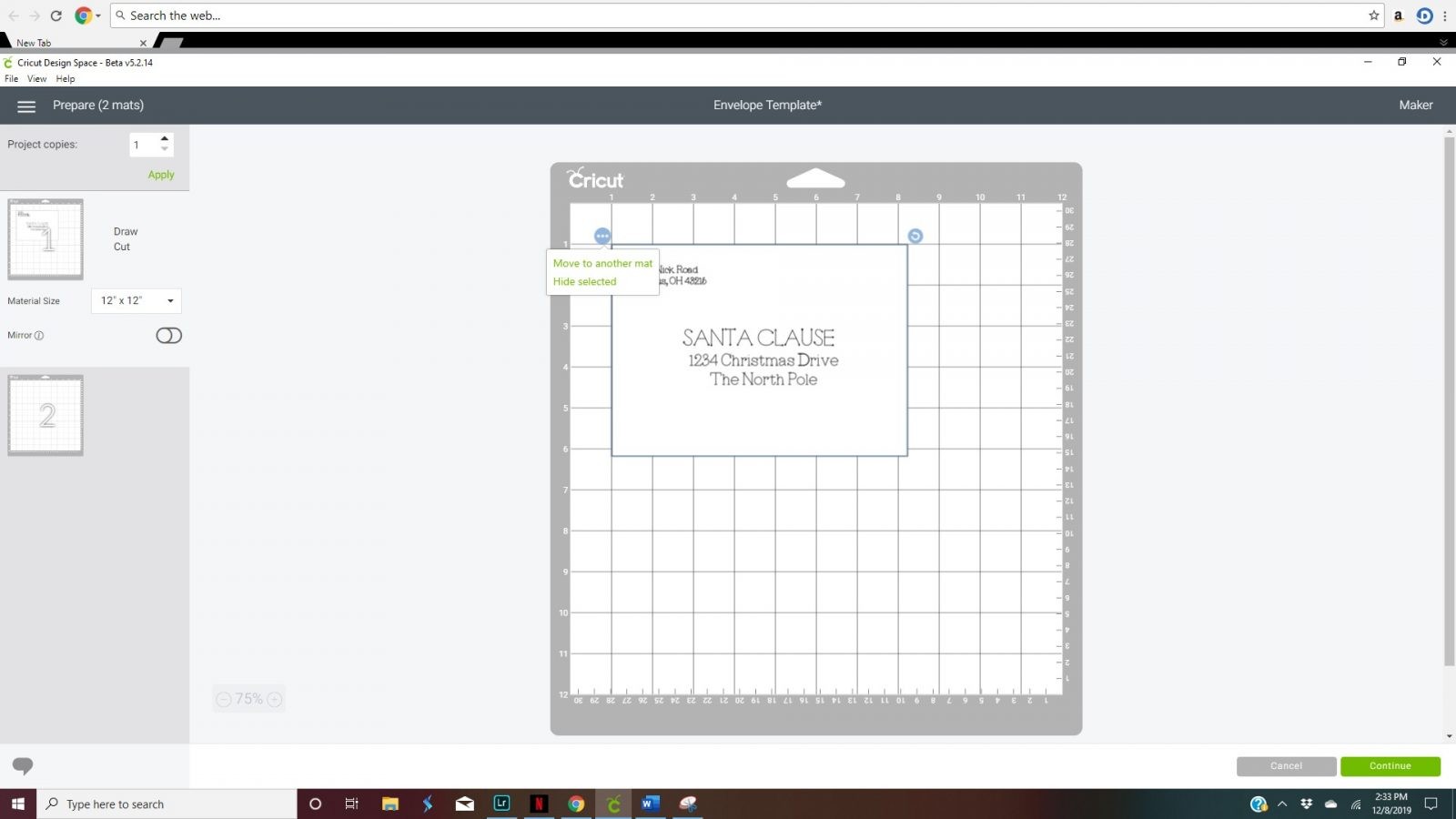This is a SUPER important step…and I accidentally skipped it several times!! Be sure that once your card is all set up, you hover back over top of your rectangle and get the three dots in the upper left corner to appear. At this step you will HIDE SELECTED…which is the rectangle. Hide the rectangle, otherwise it will cut your envelope!