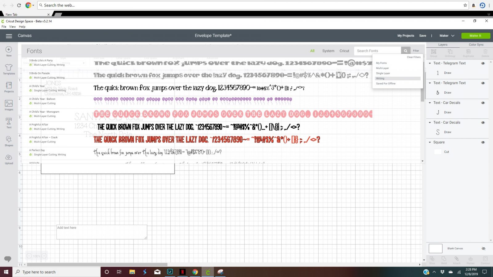Side note about the fonts, if you decide to change the font, it’s important that at the time you are designing your envelope, you choose fonts that are “writing” fonts. See screen shots below of what I’m talking about. It’s a filter setting in the font selection process. Writing fonts ensure that you get what you think you’re getting from a font versus just the outline of the font if you choose a non-writing font. I hope that makes sense.