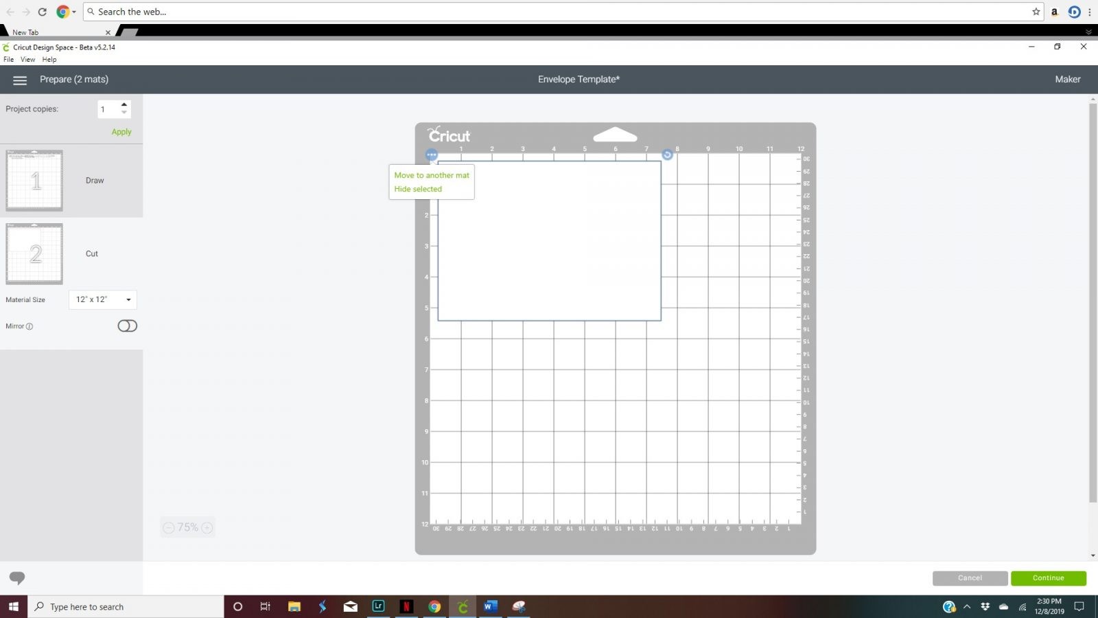 Start by selecting Mat 2 (the Cut mat) and hover over the rectangle until three dots appear in the upper left corner. Click on the three dots and select, move to another mat. Move it to Mat One.