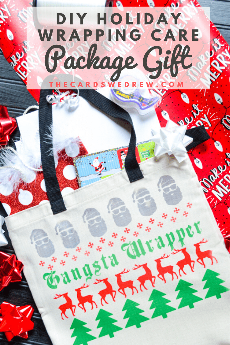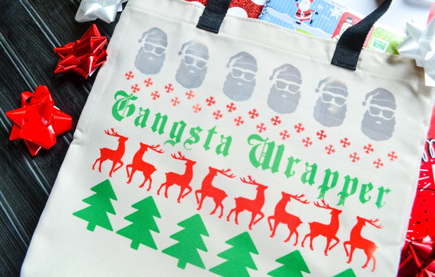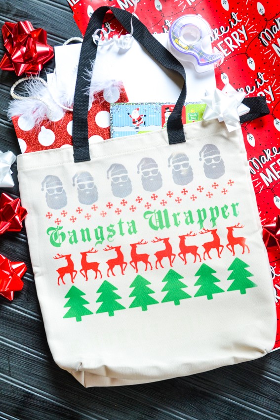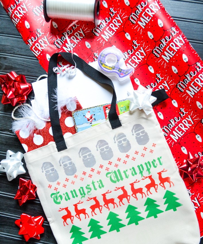 Each year I think we all struggle with what to give all the people in our lives. What should we get teachers for Christmas? What is a good neighbor gift idea? What should we get a special friend? The stores flood us with loads of stuff we don’t need and I find that months later, those cute little mugs and other items just end up getting pushed to the back of our cupboards or donated…because who really needs another mug and we ALL have plenty of candy and sweets for the holidays. I’m really trying harder to be more deliberate with my gift giving like this Neighbor Gift Idea from last year. Give people things that they will use, that will make their lives easier, or that they will have to buy already. For example, today I want to show you my idea for a Gangsta Wrapper Holiday Gift Bag idea. We ALL have to wrap gifts around the holidays! We need tape, scissors, bows, ribbon, boxes, wrapping paper, gift tags, etc. So why not give the gift of making gift wrapping EASIER for the holidays!? You can buy ALL those items at the dollar store for very inexpensive, put them into a personalized cute bag like the one I’m about to show you that I made using my Cricut, and then gift them the peace of mind of not having to worry about collecting all that stuff this holiday season! Pretty cool, right? I’ll walk you through how I made this…