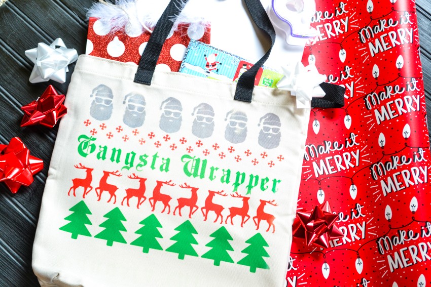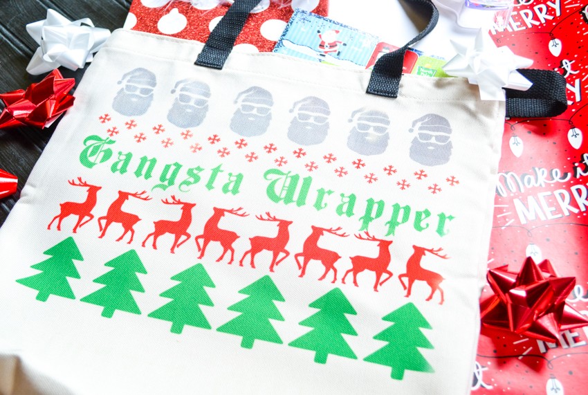 The best part of this gift, in my opinion, is the cute tote bag that I made using my Cricut Maker. I designed it in Cricut Design Space and then cut the designs out on Cricut’s Infusible Ink. You can download the Gangsta Wrapper cut file HERE and then follow the instructions on how to cut out the design. Depending on how many colors you use, there will be more cuts. For this bag, I used green, red, and gray Infusible Ink, so I had three mats to cut and weed for this tote bag. But you can make it easier on yourself (and cheaper) and just use one color if you so choose. I think this would actually be really cute in all black too.