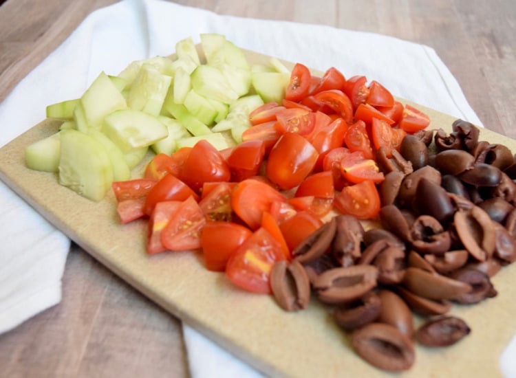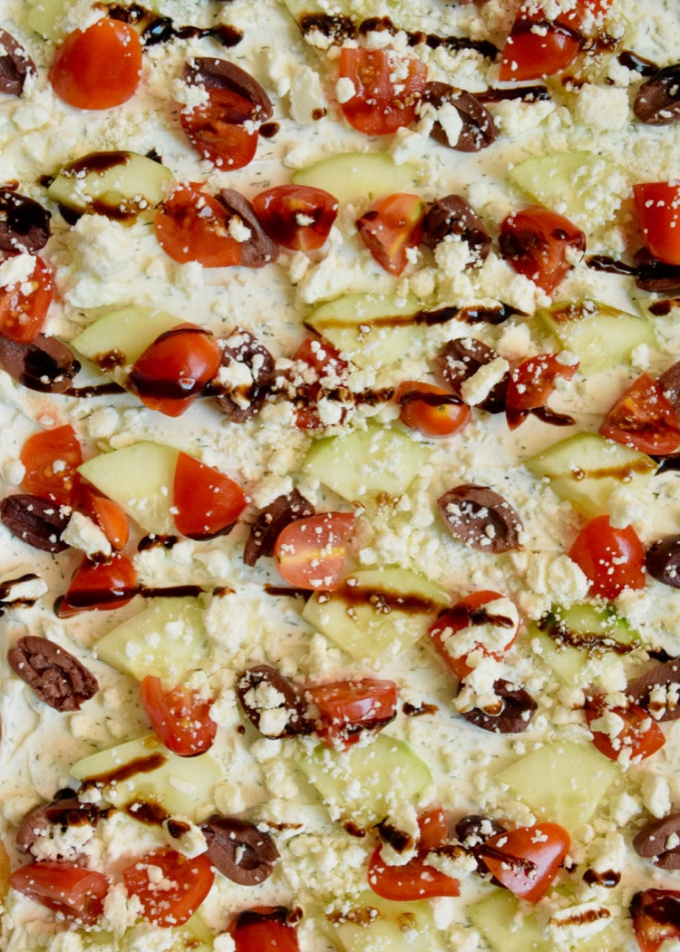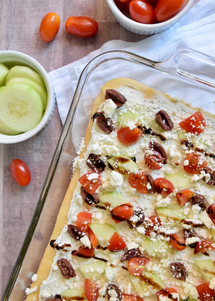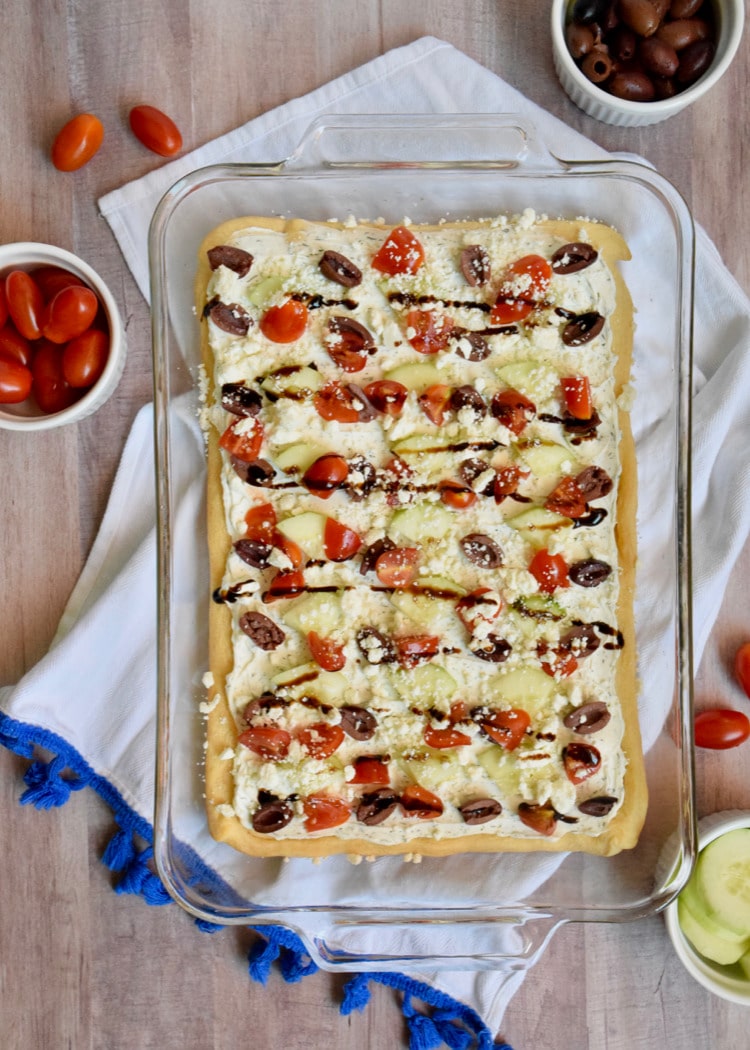 Start by unrolling the crescent roll into a 9×13 pan and then baking at 375 degrees for 13-17 minutes or until golden brown. While it’s cooling, start cutting up your veggies. For this recipe I used cucumber, tomatoes, and kalamata olives. Once your veggies are prepped, get started on assembling the cream cheese mixture. Once the crescent roll crust is cooled, you’ll add your cream cheese mixture on top of the dough and then top with your veggies.
