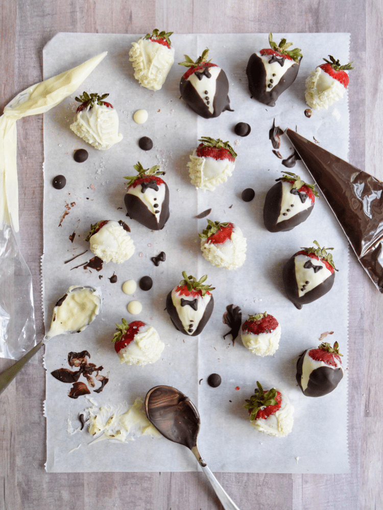 For the bride strawberries, dip the whole thing into white chocolate and then place on wax paper and let harden.