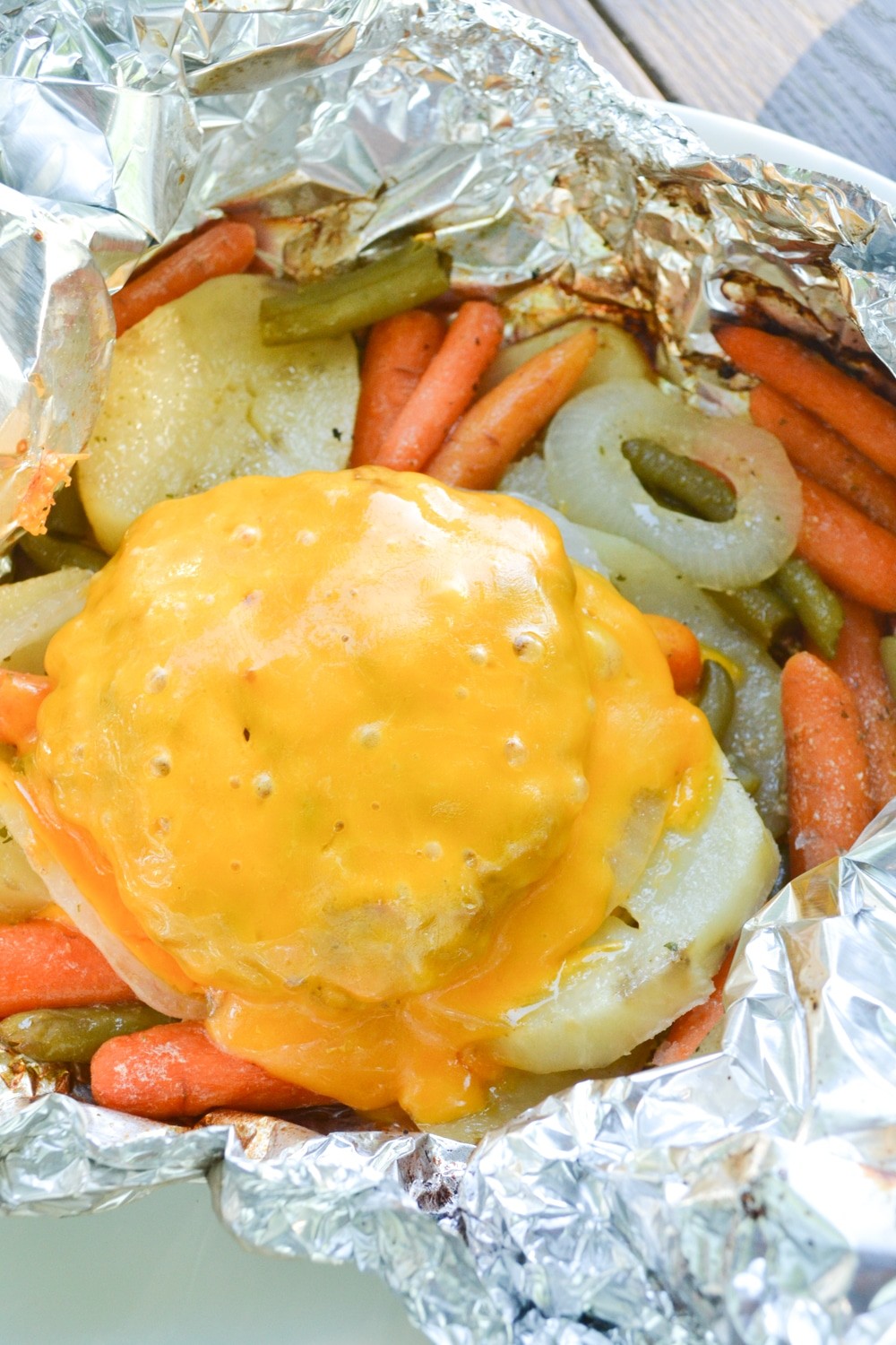 Once your timer goes off, gently open up one of the packets (don’t destroy them in the process) and survey the results. Are the carrots cooked? Are the potatoes soft? Is the meat done? If you can answer yes to all those questions then comes the moment of truth when you get to add the final delicious touch to your meal! Carefully open up the foil packets and place your cheese on top. We like to use Sargento® Sliced Sharp Natural Cheddar Cheese but if you prefer a different flavor, Sargento offers other great varieties such as Sargento® Sliced Swiss Natural Cheese and Sargento® Sliced Provolone Natural Cheese with Natural Smoke Flavor. They all melt so beautifully on top of our burgers plus they’re all 100% real, natural cheese!