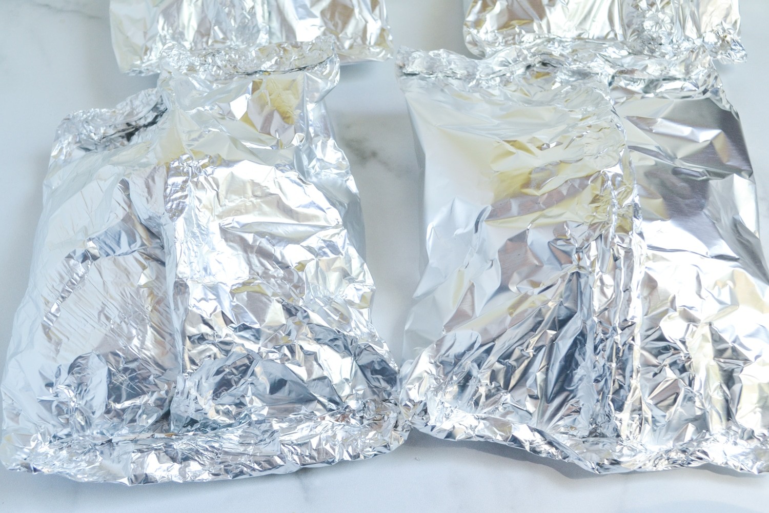 From there, we wrap them up. I start by pulling the two shortest sides of the foil together at the top and then fold downwards to create a tent.