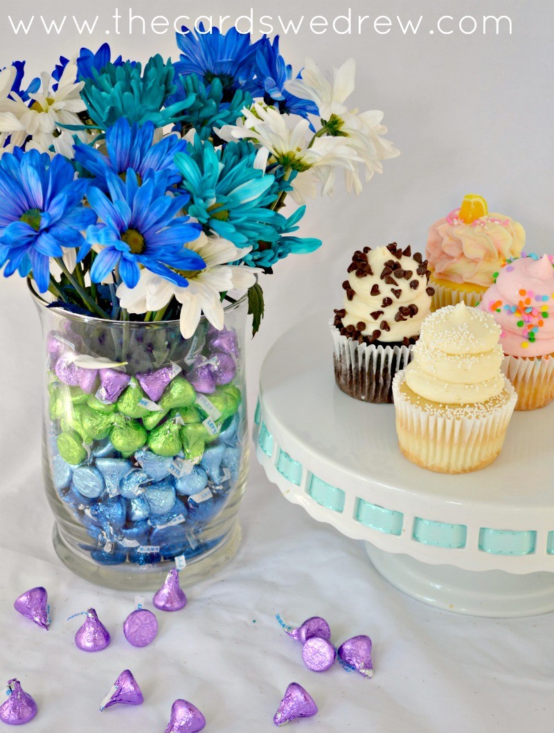 Next, you start layering your Hershey’s Kisses Chocolates around the area between the larger and smaller vase being sure to make them even all around. I layered one color at a time, then added the purple accent color at the top.