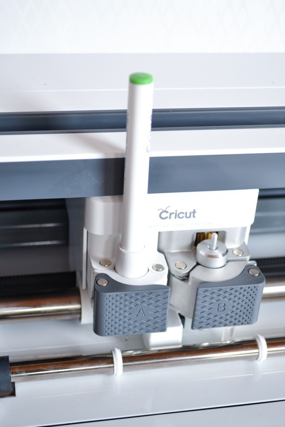 The envelope is loaded into the Cricut Maker. Next, we load our Cricut Pens. I used a green fine tip pen for this job. I loaded it into the left slot of the machine and clamped it into place.