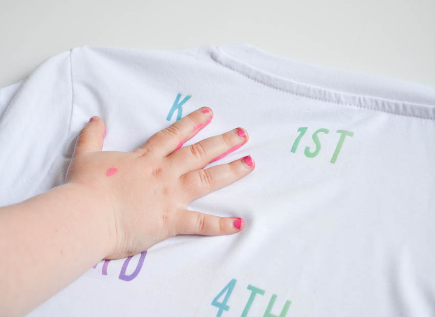You peel your infusible ink sheet off of the paper and the ink is left on the t-shirt beautifully, just like a custom screen printed design! The final step is to add a handprint for the grade you’re starting at and you have the beginning of a fun and custom keepsake for your child.