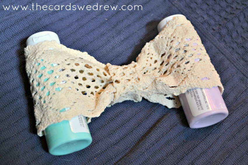 I put the whole bow, still wet, on a kitchen towel and then used two small bottles of paint to prop the sides of the bow up to give it that dimension I needed since I was using ribbon with no wire. You can skip the fabric stiffener if you use a ribbon with wire.